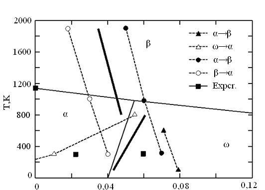 Таким чином, з розрахунку авторів [3] треба, що на відміну від перетворення α→β перехід в ω-фазу відбувається, скоріше, по механізму утворення зародків нової фази й наступного їхнього росту. При цьому час, необхідне для повного перетворення, приблизно в 2 рази більше часу, необхідного для переходу α→β. Відзначимо також, що й α↔β, і α↔ω-перетворення є зсувними, тобто перетворення повністю відбуваються за рахунок невеликих зсувів атомів.