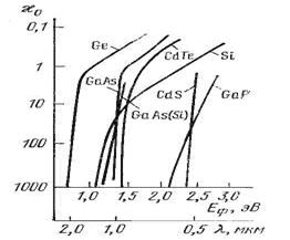Второе отличие состоит в том, что примесное поглощение ведет к генерации лишь одного типа носителей - электронов или дырок, и третье - в том, что эффективность примесного поглощения значительно меньше, чем собственного: в типичных случаях концентрация примесных атомов значительно меньше (на 6-8 порядков), чем атомов самого полупроводника. Отсюда следует, что для реализации поглощения на примесях необходимо использовать полупроводники большой толщины, а это всегда ведет к нежелательному увеличению длительности релаксационных процессов. Таким образом, примесное поглощение следует использовать лишь в тех случаях, когда не удается подобрать полупроводник с собственным поглощением в той же области спектра. Длинноволновая граница примесного фотоэффекта также определяется формулой (1.4), если в ней Еg заменить на энергетический зазор между примесным центром и разрешенной зоной, с которой осуществляется обмен носителями заряда.