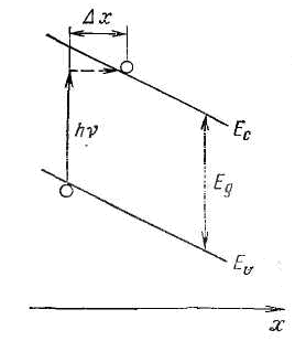 Край спектра поглощения полупроводника λгр может смещаться в длинноволновую сторону при приложении электрического поля; это явление известно как эффект Келдыша - Франца. Действие электрического поля приводит к наклону энергетических зон в пространстве, так что при энергии квантов hv<Eg электрон может оторваться от атома вследствие туннелирования между состояниями валентной зоны и зоны проводимости, разделенными в кристалле малым расстоянием Δχ (рисунок 1.3). Расчет показывает, что ширина запрещенной зоны уменьшается пропорционально квадрату напряженности электрического поля; этот сдвиг для арсенида галлия около 10-15 эВ∙В-2 ∙см-2 . При реально достижимых электрических полях удается сместить край поглощения на несколько сотых долей электрон-вольта, что по абсолютной величине мало, но может приводить к изменению коэффициента поглощения на три порядка. Эффект Келдыша - Франца используется для создания высокоскоростных модуляторов света.
