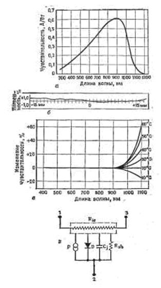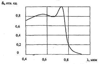 На рисунке 2.6 показана спектральная характеристика гетероэпоксиального p-i-n диода с гетеропереходом тонкого р-слоя Ga1-х Alx Asи р и nслоев GaAs. Видно, что фотодиоды такого вида с успехом могут использоваться в видимой и ультрафиолетовой области спектра. Такие фотодиоды имеют расширенный температурный диапазон использования.