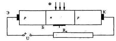 Лавинные фотодиоды на основе кремния обладают внутренним усилением до 103, высокой чувствительностью до 1 А/Вт на длине волны λ= 0,9 мкм, малой инерционностью - до 0,5 нс, низким порогом – до 10-15 Вт/Гц1/2. Биполярный фототранзистор имеет два р-n перехода. Фотовоспринимающей частью является освещаемая часть перехода база - коллектор (рисунок 2.7). Следует только иметь в виду, что во столько же раз, на столько фоторезистор усиливает фототок и во сколько увеличивается интегральная чувствительность по сравнению с аналогичным фотодиодом, уменьшается предельная частота, т.е. произведение коэффициента усиления на ширину полосы остается неизменным и соответствует этой величине для фотодиода. Спектральные характеристики фототранзисторов из германия и кремния аналогичны характеристикам фотодиодов.