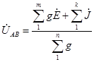Частичное напряжение от действия источника тока J можно определить исходя из того, что ток J равен сумме токов всех ветвей. Далее необходимо определить частичные напряжения от действия каждого источника э.д.с. в отдельности. Таким образом, если схема содержит k источников тока и mисточников э.д.с., то напряжение между узлами равно алгебраической сумме всех частичных напряжений, т.е.