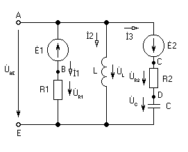 Для анализа цепей переменного тока как правило пользуются схемами замещения составленными из идеальных элементов: резистивного R, емкостного C, индуктивного L, источника э.д.с. E, источника тока J.