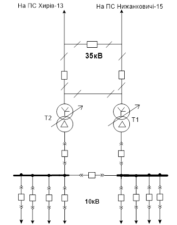 На підстанції «Добромиль-14» 35/10 кВ , схема якої наведена на рис.1.3, встановлено два трансформатори потужністю 4 і 2.5 МВ × А . Від шин 10 кВ живляться споживачі потужністю 3.366+ j 1.84МВ × А