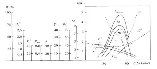 Рис. 1 - Физико-химические свойства углей в зависимости от степени углефикации: W – показатель механической прочности; ![]()