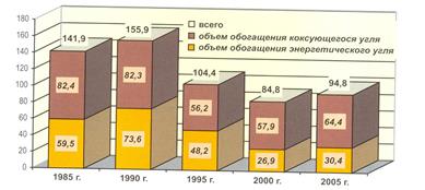 Общий объем переработки угля в нашей стране в 2005 году с учетом переработки на установках механизированной породовыборки составил 107,6 млн. т [15]. Динамика обогащения угля на обогатительных фабриках России показана на рис. 3. При этом в [15] указывается, что коксующийся уголь практически весь обогащается (в 2005 году – 92%), доля же обогащаемого энергетического угля незначительна (в 2005 году она составила всего 13%).
