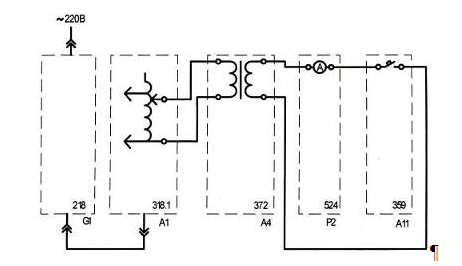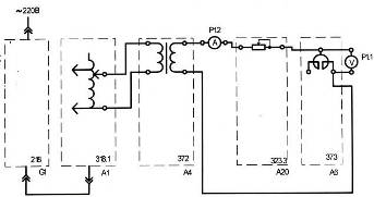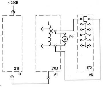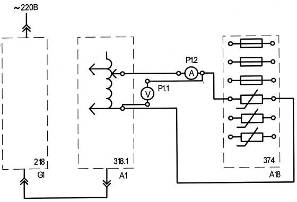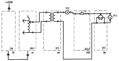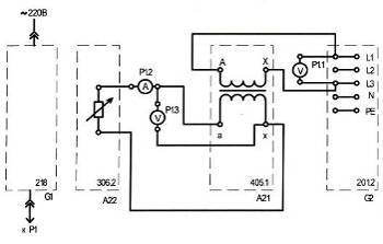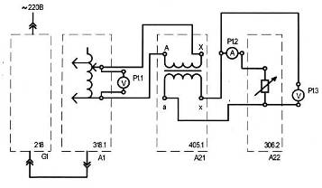ж) вращая регулировочную рукоятку автотрансформатора А1, устанавливаем по вольтметру Р1.1 напряжение на выходе автотрансформатора А1, равное 220 В