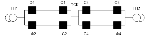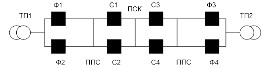Между ПСК и ТП включёны дополнительно пост параллельного соединения (ППС), который электрически соединяет КС обеих путей.