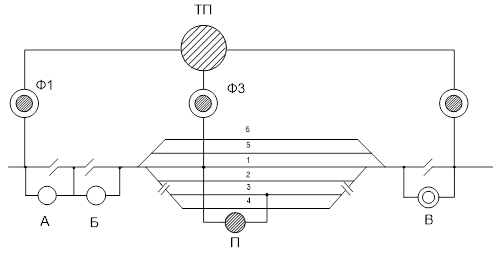 Схема соединения зависит от числа путей на перегоне и станции. На двухпутных линиях постоянного тока на станциях с числом электрифицированных путей пять и более (кроме главных); питающие сетевые фидеры соединяют с подвесками каждого главного пути па перегонах через линейные разъединители Фл1 , Фл2 , Фл4 , Фл5 . Кроме того, одну линию подключают к контактным подвескам путей станции через разъединители Ф3 , Ф31 и Ф32 - Эта линия, нормально питающая все подвески станции, является в то же время резервной для перегонных фидеров на случай отключения одной из них. При такой схеме питание может быть осуществлено через станционную линию как всей станции, так и отдельно любой из ее секций. Применение этой схемы питания требует подвешивания питающих линий вдоль всей станции. Площадь сечения проводов каждой из них должна быть равна площади сечения контактных подвесок на главных путях перегонов (в медном эквиваленте). На главных путях станции подвески иcпользуют в этом случае только для питания э.п.с., находящегося на этих путях.