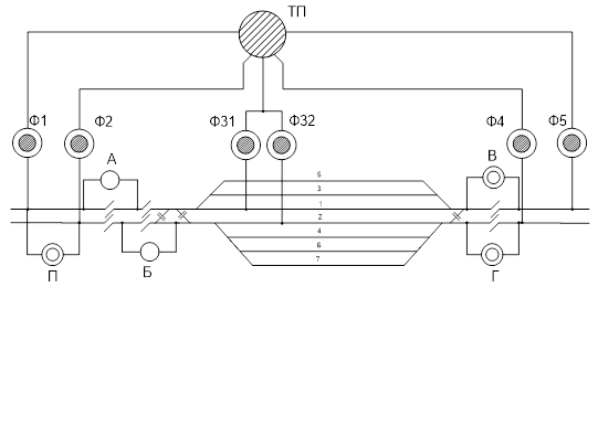 4.2 Типовые схемы питания и секционирования контактной сети однопутного участка станции с тяговой подстанцией переменного тока