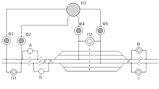 На двухпутных участках дорог однофазного переменного тока отдельные участки контактной сети питаются от разных фаз трехфазной сети, что уменьшает неравномерность се нагрузки. В месте раздела питания для устранения замыкания полозом токоприемника проводов различных фаз устраивают изолирующее сопряжение с нейтральной вставкой (рис. 2, а). При несимметричном расположении подстанции нейтральную вставку располагают у того конца станции, у которого находится тяговая подстанция (рис. 2,б.). При пяти и более электрифицированных путях на станции (кроме главных) при меняют первую схему питания и секционирования, а при меньшем числе путей - вторую схему. Сетевые фидеры соединяют с контактной сетью через линейные разъединители Ф1 , Ф2 , Ф3 , Ф4, Ф5 установленные вблизи места подключения. Поперечные разъединители с электрическим приводом П, П1 , П2 позволяют резервировать каждый из двух фидеров, подключенных к одноименной фазе. Нормально отключенные разъединители А и Б с ручным приводом предназначены для подачи напряжения на нейтральную вставку в случае остановки под ней э.п.с. Места расположения вставок выбирают с учетом профиля линии на основании тяговых расчетов.