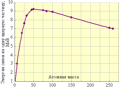 св составляет в среднем 8 МэВ/нуклон. По мере увеличения числа нуклонов в ядре удельная энергия связи убывает.