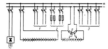 Рис. 2.4. Схема аккумуляторной установки с противоэлементами 1 – сеть аварийного освещения и электродвигателей; 2 – сеть питания мощных приводов; 3 – сеть управления.