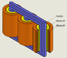 Каждая жила изолируется при помощи либо бумажной обмотки, либо эмалевого лака. Две отдельно изолированных и параллельно соединённых жилы иногда могут иметь общую бумажную изоляцию. Две таких изолированных жилы в общей бумажной изоляции называются кабелем.Особым видом проводника обмотки является непрерывно транспонированный кабель. Этот кабель состоит из жил, изолированных при помощи двух слоёв эмалевого лака, расположенных в осевом положении друг к другу, как показано на рисунке. Непрерывно транспонированный кабель получается путём перемещения внешней жилы одного слоя к следующему слою с постоянным шагом и применения общей внешней изоляции[9].