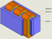 Трансформатор может состоять из одной (автотрансформатор) или нескольких изолированных проволочных, либо ленточных обмоток (катушек), охватываемых общим магнитным потоком, намотанных, как правило, на магнитопровод (сердечник) из ферромагнитного магнито-мягкого материала.