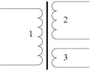 Центральная толстая линия соответствует сердечнику, 1 — первичная обмотка (обычно слева), 2,3 — вторичные обмотки