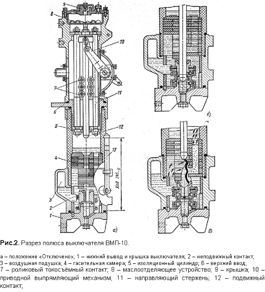 Рассмотрим подробнее конструкцию широкораспространённых масляных выключателей серии ВМП-10 (рис.1 б, рис.2). Эти выключатели имеют различное исполнение в зависимости от их назначения, например у выключателя ВМП-10к привод поставляется отдельно, а выключатели ВМПП и ВМПЭ имеют соответственно пружинный и электромагнитный привод типа ППМ-10 и ПЭ-11.