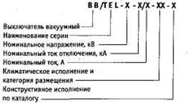 Пример записи обозначения выключателя напряжением 10 кВ с номинальным током отключения 12,5 кА, номинальным током 630 А , климатического исполнения У2, конструктивного исполнения 45 по каталогу: Выключатель вакуумный ВВДЕ1.-10-12,5/630-У2-45 ИТЕА674152.003ТУ.