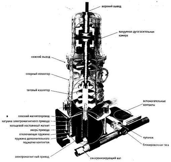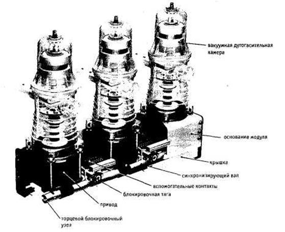 Вакуумные дуга гасительные камеры установлены внутри полых опорных изоляторов, закрепленных на общем основании. Подвижные контакты дугогасительных камер жестко соединены со своими Приводами посредством изоляционных тяг, которые также располагаются внутри опорных изоляторов. Таким образом, все элементы конструкции полюса имеют общую ось симметрии, вдоль которой совершают 1 возвратно-поступательное движение детали механизма. Это позволяет существенно упростить кинематическую схему BB/TEL, отказаться от применения нагруженных шарнирных и рычажных звеньев, что, в свою очередь, делает возможным создание коммутационного аппарата с высоким механическим ресурсом, не требующего обслуживания и регулировки в течение всего срока службы. Приводы фаз располагаются внутри основания выключателя. Они механически соединены между собой посредством общего вала, который выполняет три функции: Обеспечивает синхронизацию фаз, предохраняя от неполнофазных режимов работы Приводит в действие вспомогательные контакты выключателя