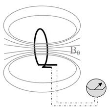 Поэтому мы должны убедиться, что приемная катушка расположена таким образом, что B0 не проходит сквозь нее. Единственный способ выполнить это требование заключается в помещении приемной катушки под правильными углами к B0 как показано на рисунке.