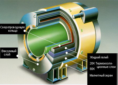 При температуре 4 Кельвина (-269°C) электрический провод “теряет” электрическое сопротивление. Однажды возбужденный в сверхпроводящем кольце ток позволяет поддерживать магнитное поле. Сверхпроводимость используется в системах с очень высокой напряженностью поля до 12 Т. Наиболее часто в клинической практике применяются системы с напряженностью поля до 1.5 Т. Большинство сверхпроводящих магнитов – магниты сквозного типа.