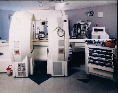 Рисунок иллюстрирует сверхпроводящую систему “двойного кольца” фирмы General Electric с полем 0.5 T. Хирург стоит между двумя полюсами магнита. Хотя такая конструкция максимально удобна для проведения интервенционных процедур за счет свободного доступа к пациенту, применение двух систем с полем 1.5 T значительно повышает стоимость установки.