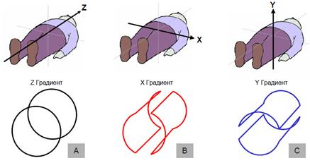 Градиентные катушки представляют собой набор проводов в магните, которые позволяют создавать дополнительные магнитные поля, в некотором отношении, накладывающиеся на главное магнитное поле B0 .