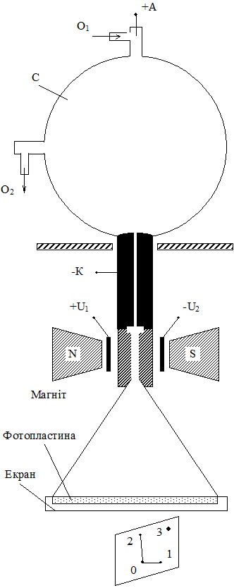 Подивимось, як цим скористався Томсон для визначення маси іонів. Потрібно було одержати пучок позитивних іонів. Для цього він виготовив установку (рис. 1) на якій посудина С через відповідні отвори О1 і О2 заповнюється досліджуваним газом. До електродів А і К прикладено високу напругу ~(3-5)×104 В. Під дією напруги електрони вириваються із атомів і газ в посудині іонізується. Електрони прямують до позитивно зарядженого електрода +А , а позитивні іони - відповідно до негативного електрода -К . В негативному електроді зроблено циліндричний отвір - канал, через який пучок позитивних іонів виводиться в ліву частину установки. Попутно ці іони проходять між зарядженими електродами +U і -U та полюсами магніту, що утворюють магнітне поле (див. рис. 1).