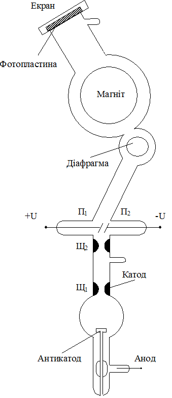 анода, катода з щілиною Щ1 і антикатода. Між анодом і катодом прикладено високу напругу від 2×104 до 5×104 В, яка і дає іонізацію.
