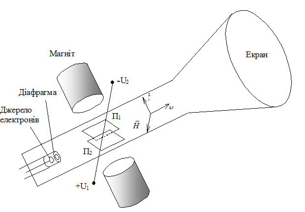 Установка Кауфмана (рис. 3) являє собою вакуумну трубку, з одного краю якої розміщені джерело електронів і діафрагма, а з другого ‑ екран або фотопластинка. Всередині трубки на шляху пучка електронів розміщені відхиляючі пластини П1 і П2 , між якими з допомогою електричної батареї створюється різниця потенціалів U 1 -U 2 . Там же розміщений постійний магніт М . Таким чином створюються магнітне і електричне поля, які відхиляють електрони.