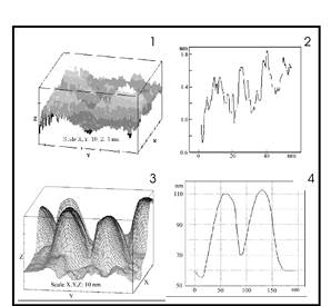 Рис. 1. АСМ изображения (1, 3) и сечение в плоскости ZУ (2, 4) исходной (1, 2) и отожженной (3, 4) ПС. Разрешение АСМ: 0.5 нм.