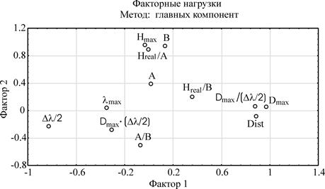 Рис. 4. Двумерный график факторных нагрузок для факторов, связывающих оптические свойства ПС с параметрами их поверхности.