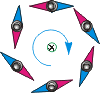 Силовым линиям магнитного поля принято приписывать определенное направление – в сторону, куда указывает северный конец магнитной стрелки. Например, на рисунке "г" расположение северных концов указывает нам, что силовые линии направлены против хода часовой стрелки. Если же изменить полярность подключения источника тока, то стрелки развернутся на 180°, и силовые линии поля будут направлены по ходу часовой стрелки (рисунок внизу). Другими словами, направление силовых линий магнитного поля проводника зависит от направления тока в этом проводнике.