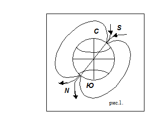 В любой точке пространства, окружающего Землю, и на её поверхности обнаруживается действие магнитных сил. Иными словами, в пространстве, окружающем Землю, создаётся магнитное поле, силовые линии которого изображены на рис.1.