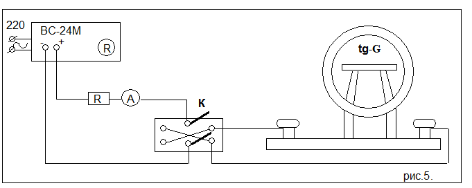 II. Собрать электрическую цепь лабораторной установки по схеме. Источником напряжения служит выпрямитель ВС–24 М.С . С помощью переключателя К изменяют направление тока, текущего через тангенс–гальванометр tg q .
