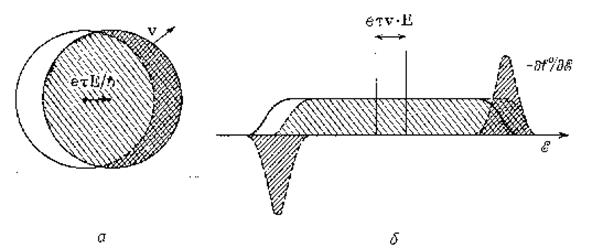 Это выглядит так, как будто вся сфера Ферми сдвинулась в k-пpoстранстве на величину (et/ħ)E. Это несколько неверная интерпретация. В действительности поле не действует на состояния вблизи дна зоны, в глубине сферы Ферми. Из-за принципа Паули поле не может придать ускорения электронам в таких состояниях; по этой же причине они не рассеиваются примесью.