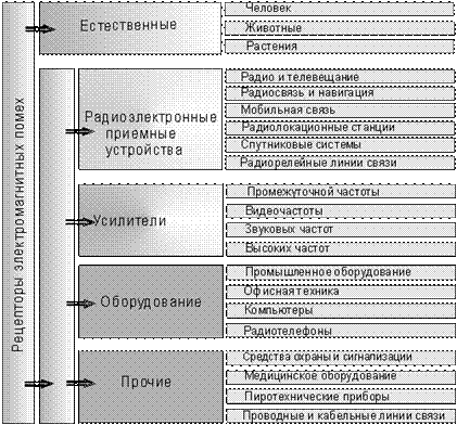 Рецепторы электромагнитной помехи - все устройства, которые в той или иной мере, обратимо или необратимо изменяют значения своих параметров под влиянием электромагнитных полей. Рецепторы могут быть естественного и искусственного происхождения. К рецепторам естественного происхождения можно отнести человека, животных и их эмбрионы, растения и их семена.