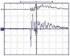 Рис. 4. Осциллограмма коммутационной помехи в цепях питания узла связи (верхняя кривая - импульсное напряжение между нулем и землей узла связи, одно деление по вертикали – 100 В; нижняя кривая - импульсное напряжение между фазой и нулем, цена деления по вертикали - 500 В). Развертка по времени - 2 мкс на деление.