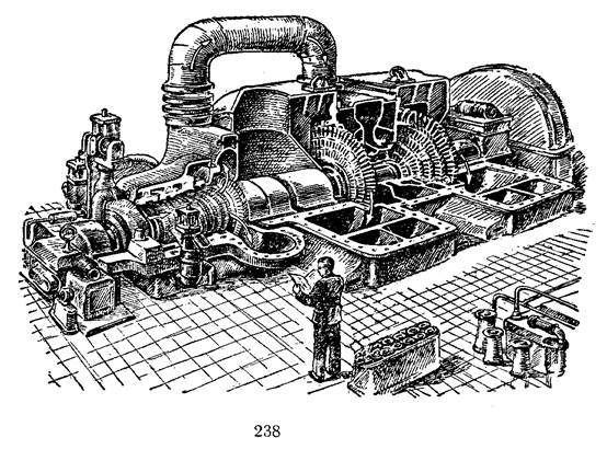 Неподвижные лопатки, укрепленные на кожухе турбины, направляют струю пара от одного ряда подвижных дисковых лопаток к другому. Таким образом, пар, проходя через турбину, отдает свою энергию на вращение вала турбины. В современных паровых турбинах, совершая много тысяч оборотов в минуту, вал вращается с исключительной плавностью. Этого не может обеспечить никакая обычная паровая машина, в которой возвратно-поступательное движение поршней преобразуется во вращение маховика.