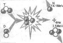 В энергетически выгодных термоядерных реакциях участвуют прежде всего изотопы водорода-дейтерий (Д) и тритий (Т). При этом из двух реакций Д+Д и Д+Т последняя в сто раз эффективнее, и во всех современных установках пытаются осуществить именно её. При слиянии ядер дейтерия и трития образуется нестабильное ядро, которое быстро распадается на альфа-частицу (ядро гелия-4) с энергией 3,5 МэВ и нейрон с энергией 14,1 МэВ (то есть 20% и 80% общей энергии соответственно):