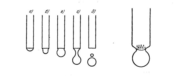 Описанный способ экспериментального определения коэффициента поверхностного натяжения дает хорошие результаты, несмотря на то, что в действительности отрыв капли происходит не совсем так, как описано выше. На самом деле капля не отрывается по линии окружности шейки. В момент, когда размер капли достигает значения, определяемого равенством (5), шейка начинает быстро сужаться, как это показано на рис. 5,г, причем ей сопутствует еще одна маленькая капля, как это показано на рис. 5,д.