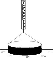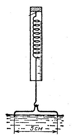 Простой прибор для грубых измерений такого рода показан на рис. 7. Опустим в воду медную проволочку, изогнутую, как показано на рисунке, зацепит проволочку чувствительным пружинным динамометром и будем очень медленно, без толчков поднимать ее вверх. Показание динамометра будет постепенно увеличиваться и достигнет максимального значения, когда из воды покажется водяная пленка, повисшая на проволочке. Отсчитав показание динамометра и приняв во внимание вес проволочки, мы найдем силу, которая растягивает пленку. При длине проволочки 5 см эта сила составляет около 0,0070 Н; отсюда