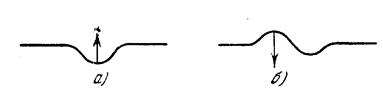 чем давление в соседних слоях, где поверхность осталась плоской. Возникшая таким образом разность давлений заставляет жидкость из соседних слоев приливать под вогнутую поверхность, и жидкость снова поднимается к начальному уровню, но проходит его по инерции за счет накопленной кинетической энергии. Поверхность поэтому станет выпуклой, и давление, обусловленное кривизной ее поверхности, будет теперь направлено вниз (рис. 9, б).