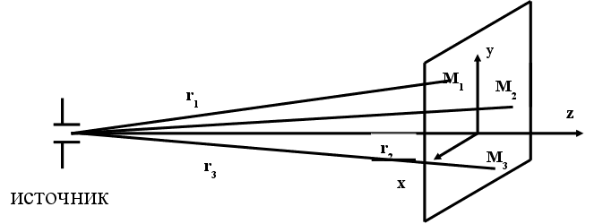т.к. источник очень далеко, то расстояния до точки можно считать одинаковым. Из физического смысла задачи, можно утверждать, что изменения полей по координате y, х нет, т.е.:
