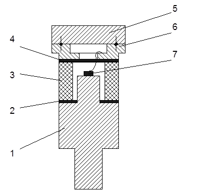1 - тримач, 2 - шайба припою, 3 - втулка, 4 - шайба припою, 5 - кришка, 6 - фланець, 7 - кристал.