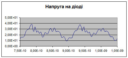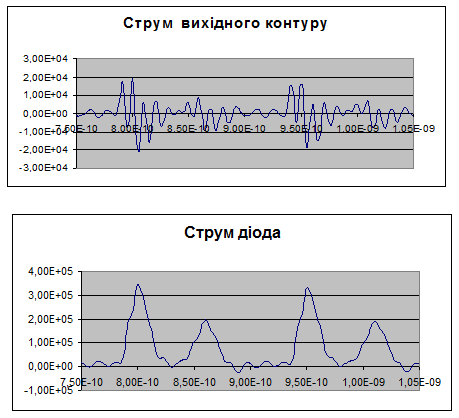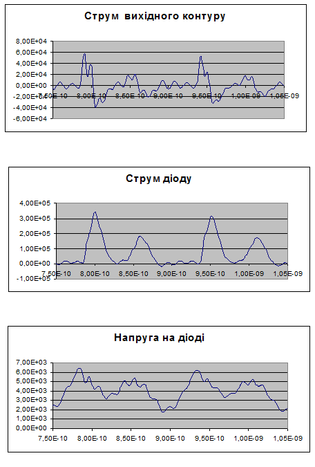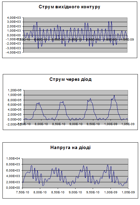 При даних параметрах ми одержали наступні результати: середній струм через діод складає 7.4×104 А/см2 , потужність змінного сигналу дорівнює 105 Вт/см2 , потужність 15-ой гармоніки в навантаженні вихідного контуру дорівнює 1.9×103 Вт/см2 . Цим даним відповідають графіки, приведені на мал.2.4. Втрати потужності на помноження складають 19 дБ . При подальшому зменшенні R1 втрати потужності на помноження зростають і при R1 =4.72×10-5 Ом×см2 вони складають 24 дБ . Графіки преведені на мал.2.5. Можна сказати, що при даному значенні R1 помноження ще не відбувається. При збільшенні R1 відбувається змикання, тобто ми маємо ситуацію коли коливання у вихідному контурі ще не загаснули, а вже надходить наступний імпульс струму. У цьому випадку немає синхронізації вихідного сигналу вхідним відносно низькочастотного сигналу. Це відображається на мал.2.6.