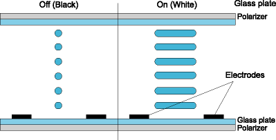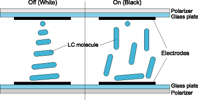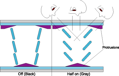 Рис. 1: В дисплеях, сделанных по технологии TN+Film, жидкие кристаллы выравниваются перпендикулярно подложке, так же, как и в обычных TFT-дисплеях. Плёнка на верхней поверхности позволяет увеличить угол обзора.