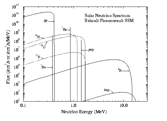 Нейтрино, рождающиеся в этих реакциях, имеют разные энергии. Так p-p нейтрино имеют энергии около 420 кэВ, бериллиевые и борные нейтрино имеют энергии в среднем выше 814 кэВ. Ниже показан спектр нейтрино, рассчитанный ведущими физиками в этой области John Bahcall и Pinsonneault, 1998.