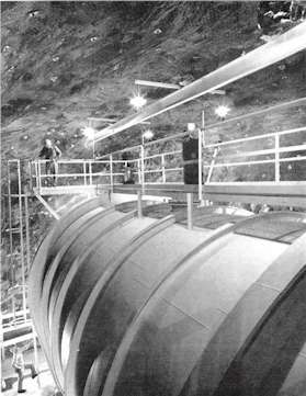 Начиная с 1955 г,. Дэвис и его сотрудники упорно работали над повышением чувствительности перхлорэтиленового детектора нейтрино. В результате их усилий чувствительность детектора увеличилась к почти в 30000 раз! В его современном виде нейтринный детектор представляет собой грандиозное сооружение. Гигантский резервуар, наполненный жидким перхлорэтиленом, имеет объем около 400 кубометров. Расположение детектора глубоко под землей диктуется необходимостью свести к минимуму помехи, приводящие к образованию радиоактивных изотопов аргона без поглощения ядрами хлора нейтрино. Указанные помехи вызываются проникающей компонентой космических лучей. Мю-мезоны, входящие в состав этой компоненты, взаимодействуя с веществом, порождают быстрые протоны, которые, сталкиваясь с ядрами хлора, образуют радиоактивный изотоп 37 Ar.