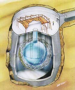 Чтобы исследовать это, консорциум Канадских, Американских и Британских университетов разработал Sudbury Neutrino Observatory. Обсерватория расположена под землей на глубине два километра в никелевом руднике. Для детектирования используется тяжелая вода – вода, в которой атомы водорода заменены его более тяжелым изотопом, дейтерием. При взаимодействии нейтрино с тяжелой водой испускается электрон со скоростью, большей скорости света в воде. И этот электрон генерирует световое излучение, называемое Черенковским излучением. Измеряя количество этих вспышек света, можно определить количество нейтрино.